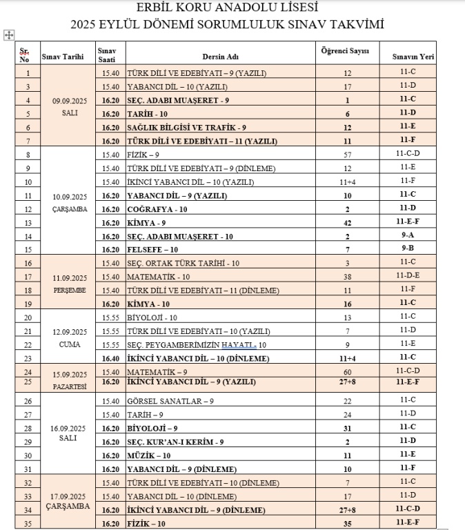 EYLÜL 2025 SORUMLULUK SINAV TAKVİMİ